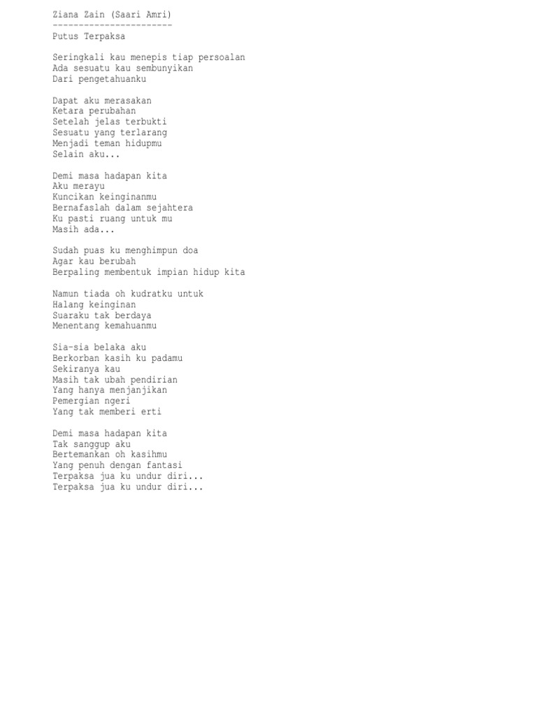 Other Apps - January 21 2019 Lirik lagu Ziana Zain Saari Amri Putus Terpaksa Seringkali kau menepis tiap persoalan Ada sesuatu kau sembunyikan Dari pengetahuanku Dapat aku merasakan Ketara perubahan Setelah jelas terbukti. Malaysia Ziana Zain. Kau dipaksa aku terpaksa Lyrics.